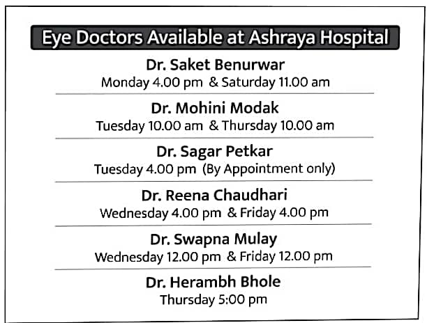 Contact Us Address Ashraya Opticals and Contact Lens Clinic, C/O Ashraya Hospital, MIDC, Dombivli East, Pin 421203Shop is Open on All Days 10:00 Am to 9:00 Pm Lunch Time 2:00 – 3:30 Pm Contact : 9769720485 / 9594020485 Email : ashrayaoptical@gmail.com Whatsapp FOR EYE DOCTORS APPOINTMENT CONTACT : 02512440990 / 9136873687 VICKY NAGDEV - OPTOM Whatsapp FOR VICKY SIR’S APPOINTMENT(FOR NUMBER CHECKING / SPECTACLES AND CONTACT LENS)CONTACT : 9769720485 / 9594020485DAILY 10:00 – 2:00 / 5:00-9:00 EXCEPT SUNDAYS & PUBLIC HOLIDAYS From Left to RightDr. Reena Choudhari, Dr. Mohini Modak, Dr. Swapna Mulay From Left to RightDr. Saket Benurwar, Dr. Sagar Petkar, Dr. Herambh Bhole